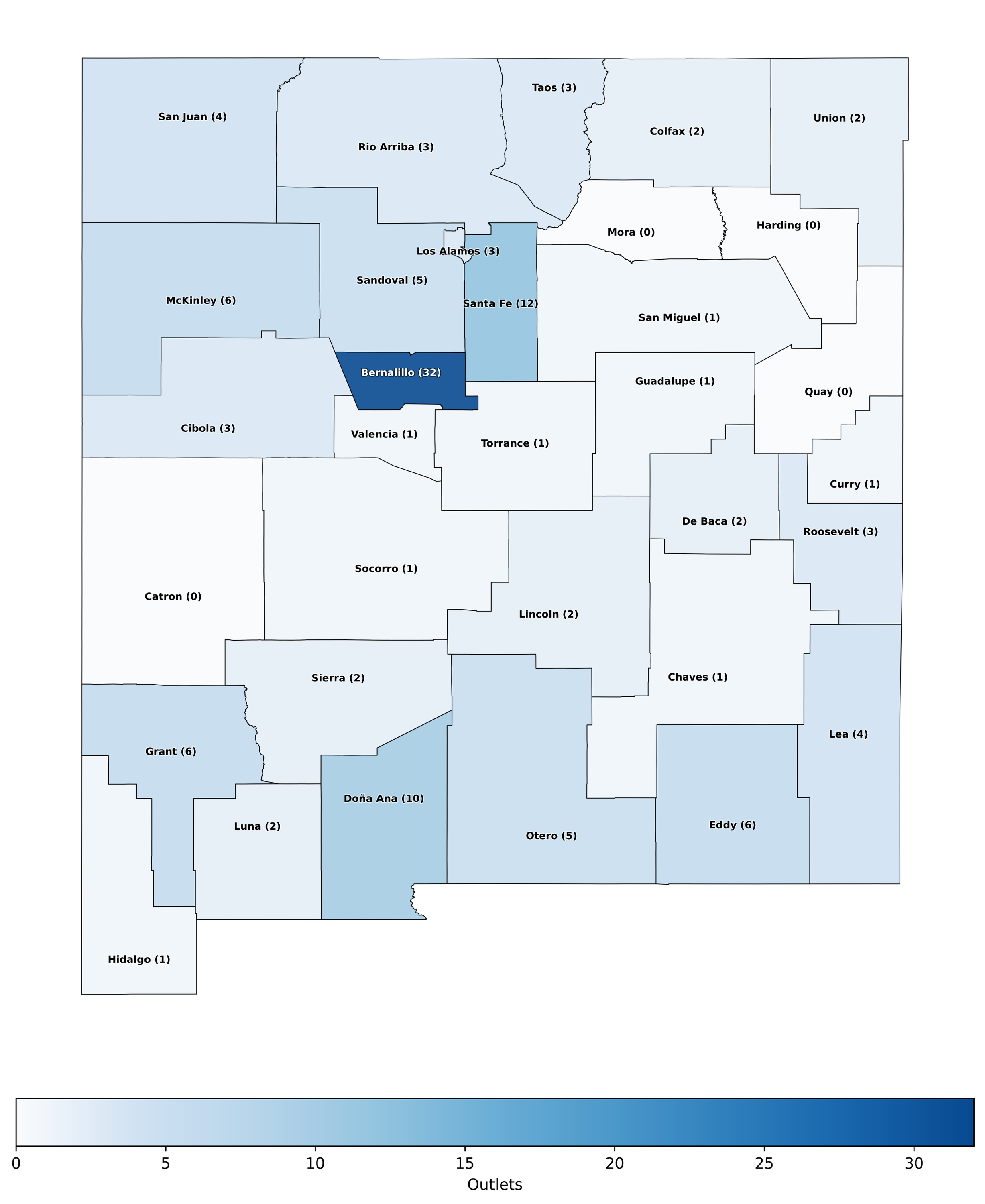 Eight counties only have one outlet—even places with decent population size, like Valencia and Chavez.